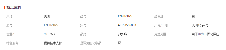 CN9021 NS丙烯酸酯產(chǎn)品描述CN9021 NS 用于UV/EB 固化層壓膠及壓敏膠配方。可提供良好的附著力,柔韌性及耐水性,特別對于玻璃材料。產(chǎn)品特征對玻璃附著力高伸長率耐濕產(chǎn)品性質(zhì)良好的附著力良好的耐水性高伸長率柔韌性好建議應(yīng)用層壓材料壓敏膠CN9021 NS 典型物理和化學(xué)性質(zhì)外觀清澈液體顏色,APHA100粘度,厘泊 @60℃